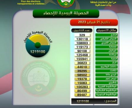 وكالة أخباراليوم قالت اللجنة المستقلة للانتخابات إن الاحصاء ذي الطابع الانتخابي وصل يوم أمس الاثنين 21فبرلير 2023 إلى مليون و 219ألف و مائة شخص و أوضحت في مناشير على صفحتها للفيس بوك التوزيعات حسب الولايات حيث تصدرت ولاية اترارزة بالغة 155الف ناخب، فيما تلتها ولاية الحوض الشرقي التي وصلت إلى 130ألف فيما جاءت في […]