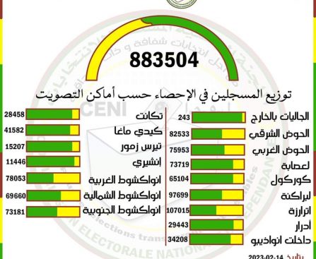 وكالة أخباراليوم أعلنت اللجنة المستقلة للانتخابات صباح اليوم وصول عدد المسجلين 883504 ناخبًا، على عموم ولايات الوطن، فضلا عن الجاليات بالخارج. وحسب اللجنة فإن توزيع المسجلين في الإحصاء حسب أماكن التصويت كان على النحو التالي: الجاليات بالخارج 243 الحوض الشرقي 82533 الحوض الغربي 75953 لعصابه […]