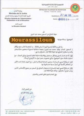 أخبار اليوم تنشر الرسالة الجوابية من ادارة السجون على طلبات محامي ولد عبد العزيز